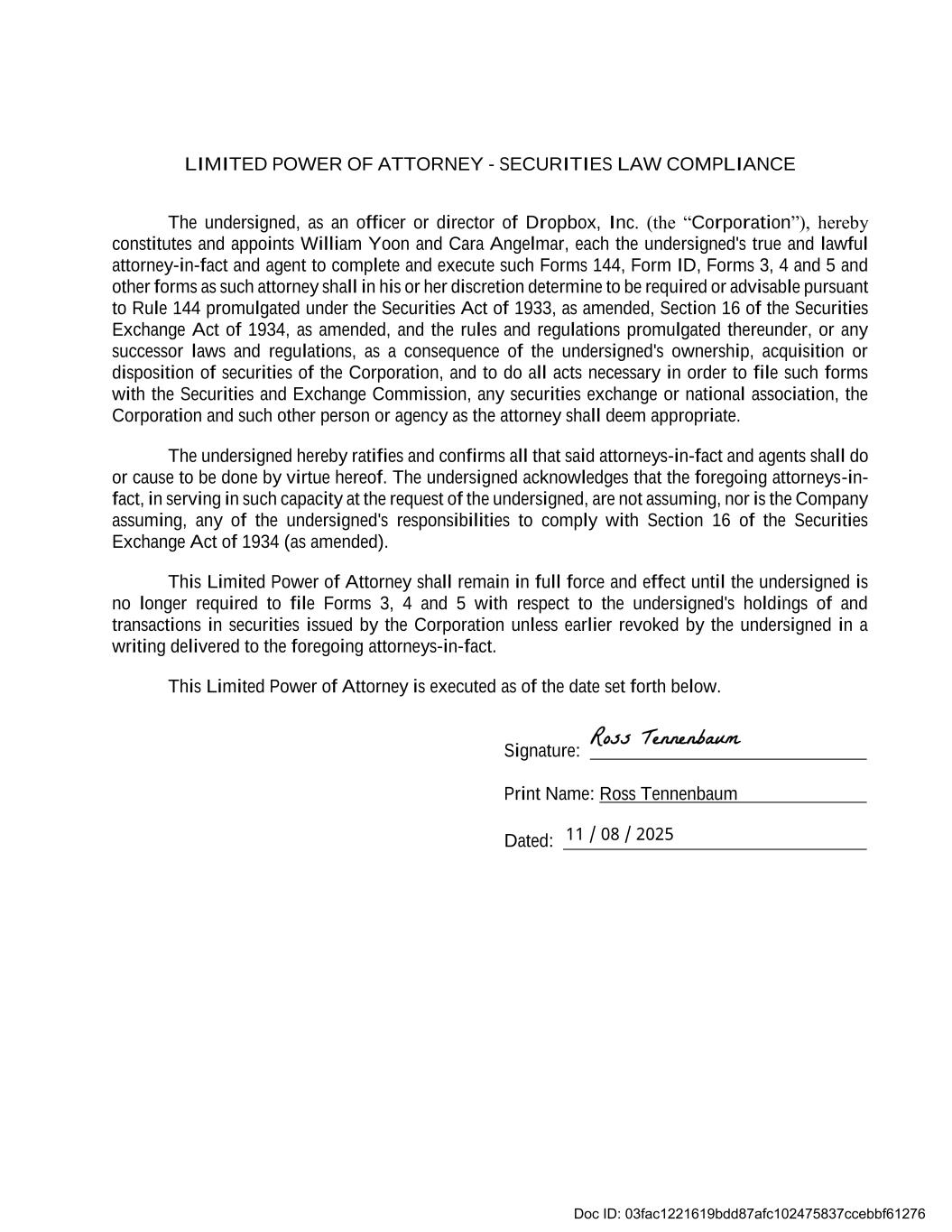 LIMITED POWER OF ATTORNEY - SECURITIES LAW COMPLIANCE The undersigned, as an officer or director of Dropbox, Inc. (the “Corporation”), hereby constitutes and appoints William Yoon and Cara Angelmar, each the undersigned's true and lawful attorney-in-fact and agent to complete and execute such Forms 144, Form ID, Forms 3, 4 and 5 and other forms as such attorney shall in his or her discretion determine to be required or advisable pursuant to Rule 144 promulgated under the Securities Act of 1933, as amended, Section 16 of the Securities Exchange Act of 1934, as amended, and the rules and regulations promulgated thereunder, or any successor laws and regulations, as a consequence of the undersigned's ownership, acquisition or disposition of securities of the Corporation, and to do all acts necessary in order to file such forms with the Securities and Exchange Commission, any securities exchange or national association, the Corporation and such other person or agency as the attorney shall deem appropriate. The undersigned hereby ratifies and confirms all that said attorneys-in-fact and agents shall do or cause to be done by virtue hereof. The undersigned acknowledges that the foregoing attorneys-in- fact, in serving in such capacity at the request of the undersigned, are not assuming, nor is the Company assuming, any of the undersigned's responsibilities to comply with Section 16 of the Securities Exchange Act of 1934 (as amended). This Limited Power of Attorney shall remain in full force and effect until the undersigned is no longer required to file Forms 3, 4 and 5 with respect to the undersigned's holdings of and transactions in securities issued by the Corporation unless earlier revoked by the undersigned in a writing delivered to the foregoing attorneys-in-fact. This Limited Power of Attorney is executed as of the date set forth below. Signature: Print Name: Ross Tennenbaum Dated: 11 / 08 / 2025 Doc ID: 03fac1221619bdd87afc102475837ccebbf61276