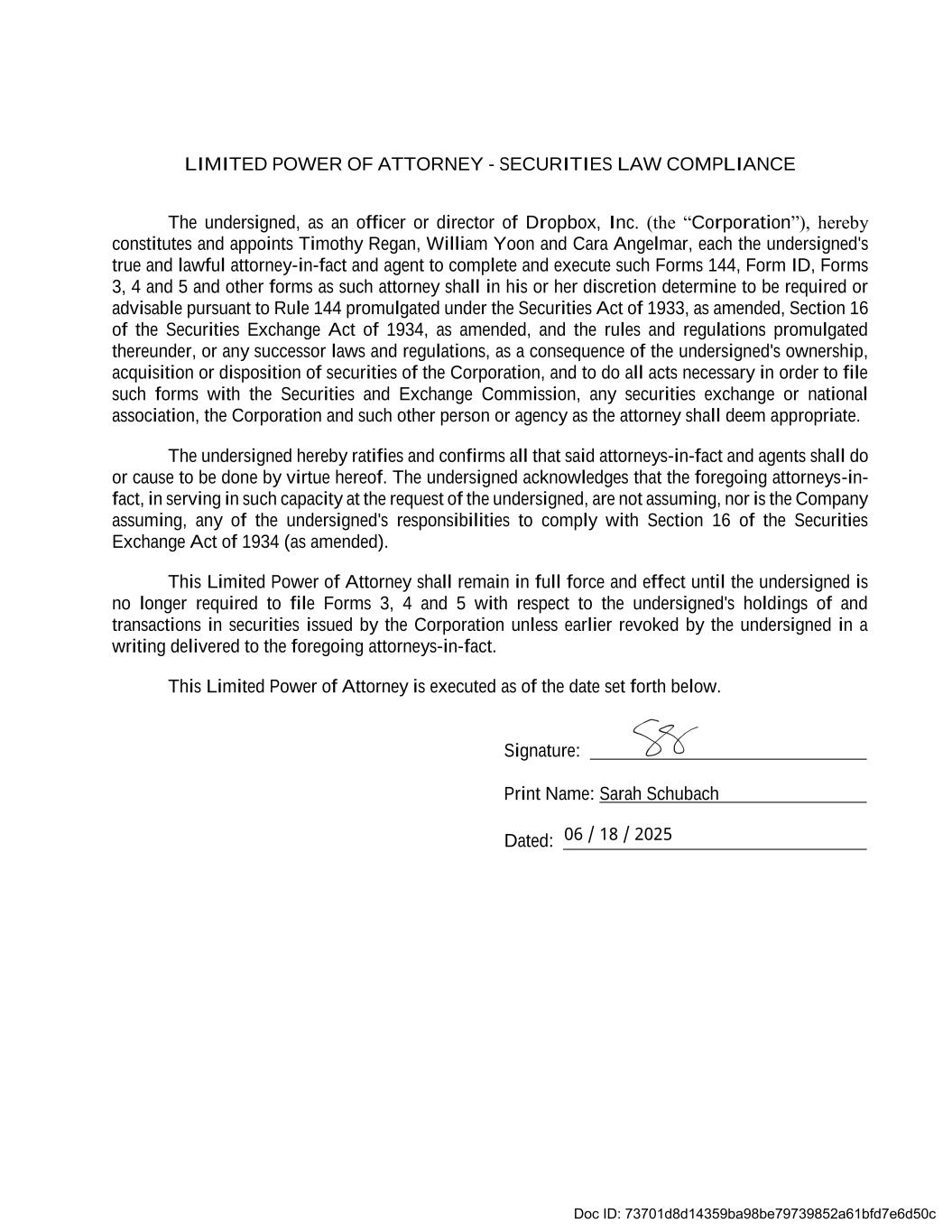 LIMITED POWER OF ATTORNEY - SECURITIES LAW COMPLIANCE The undersigned, as an officer or director of Dropbox, Inc. (the “Corporation”), hereby constitutes and appoints Timothy Regan, William Yoon and Cara Angelmar, each the undersigned's true and lawful attorney-in-fact and agent to complete and execute such Forms 144, Form ID, Forms 3, 4 and 5 and other forms as such attorney shall in his or her discretion determine to be required or advisable pursuant to Rule 144 promulgated under the Securities Act of 1933, as amended, Section 16 of the Securities Exchange Act of 1934, as amended, and the rules and regulations promulgated thereunder, or any successor laws and regulations, as a consequence of the undersigned's ownership, acquisition or disposition of securities of the Corporation, and to do all acts necessary in order to file such forms with the Securities and Exchange Commission, any securities exchange or national association, the Corporation and such other person or agency as the attorney shall deem appropriate. The undersigned hereby ratifies and confirms all that said attorneys-in-fact and agents shall do or cause to be done by virtue hereof. The undersigned acknowledges that the foregoing attorneys-in- fact, in serving in such capacity at the request of the undersigned, are not assuming, nor is the Company assuming, any of the undersigned's responsibilities to comply with Section 16 of the Securities Exchange Act of 1934 (as amended). This Limited Power of Attorney shall remain in full force and effect until the undersigned is no longer required to file Forms 3, 4 and 5 with respect to the undersigned's holdings of and transactions in securities issued by the Corporation unless earlier revoked by the undersigned in a writing delivered to the foregoing attorneys-in-fact. This Limited Power of Attorney is executed as of the date set forth below. Signature: Print Name: Sarah Schubach Dated: 06 / 18 / 2025 Doc ID: 73701d8d14359ba98be79739852a61bfd7e6d50c