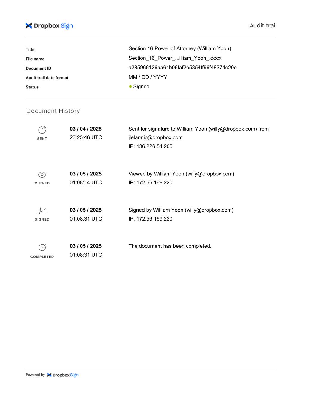 Section 16 Power of Attorney (William Yoon) Section_16_Power_...illiam_Yoon_.docx a285966126aa61b06faf2e5354ff96f48374e20e MM / DD / YYYY Signed 03 / 04 / 2025 23:25:46 UTC Sent for signature to William Yoon (willy@dropbox.com) from jlelannic@dropbox.com IP: 136.226.54.205 03 / 05 / 2025 01:08:14 UTC Viewed by William Yoon (willy@dropbox.com) IP: 172.56.169.220 03 / 05 / 2025 01:08:31 UTC Signed by William Yoon (willy@dropbox.com) IP: 172.56.169.220 The document has been completed.03 / 05 / 2025 01:08:31 UTC