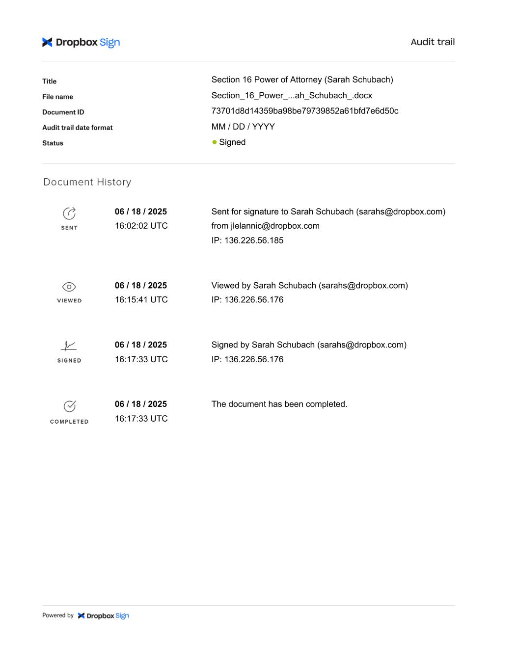 Section 16 Power of Attorney (Sarah Schubach) Section_16_Power_...ah_Schubach_.docx 73701d8d14359ba98be79739852a61bfd7e6d50c MM / DD / YYYY Signed 06 / 18 / 2025 16:02:02 UTC Sent for signature to Sarah Schubach (sarahs@dropbox.com) from jlelannic@dropbox.com IP: 136.226.56.185 06 / 18 / 2025 16:15:41 UTC Viewed by Sarah Schubach (sarahs@dropbox.com) IP: 136.226.56.176 06 / 18 / 2025 16:17:33 UTC Signed by Sarah Schubach (sarahs@dropbox.com) IP: 136.226.56.176 The document has been completed.06 / 18 / 2025 16:17:33 UTC